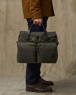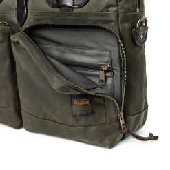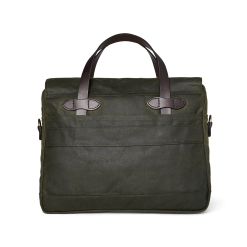 Our highest-capacity briefcase. the 24-Hour Briefcase combines the organizing ability of our Padded Computer Bag with the sleek design of our Original Briefcase. The waxed Tin Cloth material protects gear from foul weather and spray. This tightly woven canvas duck has been thoroughly saturated with wax for water resistance. The Bridle Leather handles are vegetable-tanned with tallows and wax added in the final stages. giving the leather a deep luster and lasting flexibility. The main zipper is solid brass from YKK® for a lifetime of rust-free operation. The interior is fully lined with unwaxed cotton. with a padded sleeve for laptops up to 15‚Äù. Exterior zippered pockets have organization pockets inside. Rear trolley strap slides over luggage handles. Detachable. adjustable webbing shoulder strap.