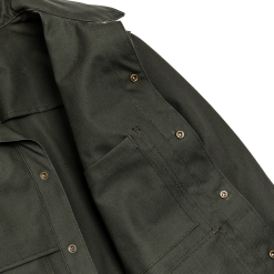 This jac-shirt is a barrier against wind. briars. and brush with minimal bulk. Unlined. it provides protection without causing overheating even as the temperature or your activity levels climb. The 10.5-oz. 2-ply by 2-ply cotton duck canvas is treated with a special hardening agent that adds to its exceptional abrasion resistance. Treated with a long-lasting DWR. it repels light rain and resists staining. An extra layer over the front shoulders adds additional weather resistance and hides the two snap-secure chest pockets. The side-entry hand pockets are easy to access and are bar-tacked for durability. The metal snaps used for the adjustable cuffs and front closure are virtually unbreakable. and are easy to operate while wearing work gloves. Side-seam slits provide greater ease of motion.