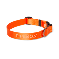Our Nylon Dog Collar is ideal for active dogs who love to swim or run through the muddy outdoors. It’s built with tough 1” wide webbing that’s washable. dries quickly. and resists odors. The rustproof hardware is industrial-strength plastic for maximum longevity and is infinitely adjustable for a custom fit. Solid brass D-ring for leash attachment. Custom Filson logo.