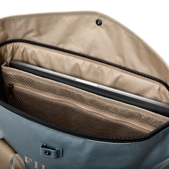 The bottom panel is padded to protect gear. as is the interior pocket that’s sized for laptops up to 16. An interior mesh zippered pocket and exterior stow pocket provide organization and easy access to essentials. The sturdy coil zipper for the main compartment is covered protected by a storm flap that secures with a corrosion-resistant snap. Strong 2-wide nylon-webbing handles. 23L capacity.