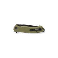 Our Assisted Opening Knife features subtle drop-point blade geometry for control. and a flat grind blending slicing ability with strength. The 3.5 high-carbon stainless steel blade holds its edge and sharpens easily. Thumb-studs on both sides of blade enable ambidextrous opening. A liner-lock mechanism prevents accidental blade closure during hard use. The flipper tab serves double-duty as a finger-guard. and the textured spine provides traction when hands are slippery. Textured G10 handle scales for added grip. Features an extended spacer with lanyard hole and a reversible pocket clip for carrying on either side.