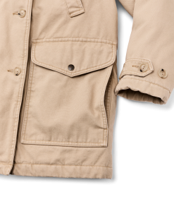 Our Canvas Packer Coat is patterned after our iconic rancher’s coat. in durable cotton canvas that resists abrasion and punctures. The torso is lined with a cotton/lyocell blend and the sleeves with polyester that slips easily over layers. The lightweight. quick-drying insulation and fleede-lined collar provide warmth. Large cargo pockets are protected by snapped flaps and the handwarmer pockets are set high for easy access while seated. Button-secure front and adjustable cuffs.