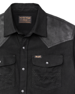 A durable special-edition shirt made from 7.3-oz. denim with a right-hand twist. Denim’s legendary dependability and comfort on ranches. jobsites. and Naval ships has made it a favorite fabric for work and daily wear. The shoulders are made from a washable waxed canvas that adds durability and a bit of water resistance if caught in a shower without a jacket. The back yoke is vented for breathability. and the front is pointed for Western flair. Antiqued bronze snaps secure the front. pocket flaps and cuffs. Forearms are reinforced with the same washable waxed canvas as the yoke. Wrangler’s signature ‘W’ is embroidered on the front pockets.