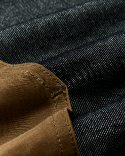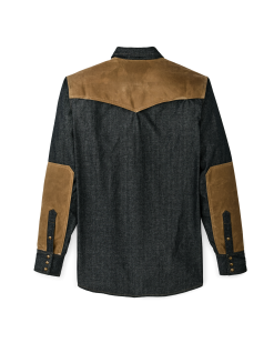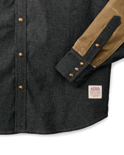 A durable special-edition shirt made from 7.3-oz. denim with a right-hand twist. Denim’s legendary dependability and comfort on ranches. jobsites. and Naval ships has made it a favorite fabric for work and daily wear. The shoulders are made from a washable waxed canvas that adds durability and a bit of water resistance if caught in a shower without a jacket. The back yoke is vented for breathability. and the front is pointed for Western flair. Antiqued bronze snaps secure the front. pocket flaps and cuffs. Forearms are reinforced with the same washable waxed canvas as the yoke. Wrangler’s signature ‘W’ is embroidered on the front pockets.